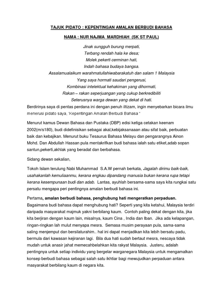 Skrip pidato bahasa melayu sekolah rendah. Contoh soal to akuntansi contoh teks pidato. Teks pidato bahasa melayu tonggak perpaduan bangsa.